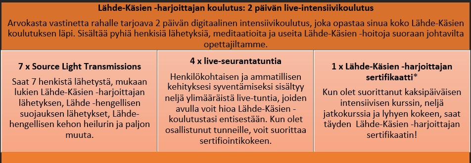 Arvokasta vastinetta rahalle tarjoava 2 päivän digitaalinen intensiivikoulutus, joka opastaa sinua koko Lähde-Käsien koulutuksen läpi. Sisältää pyhiä henkisiä lähetyksiä, meditaatioita ja useita Lähde-Käsien -hoitoja suoraan johtavilta opettajiltamme.
